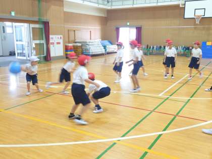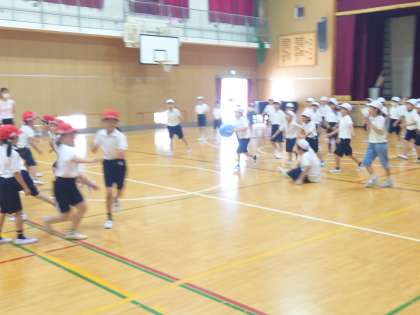 今日の体育の時間は、2学級合同で「すわりおに」や「ドッジボール」をしました。