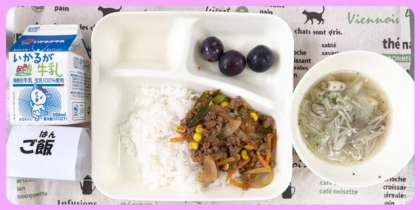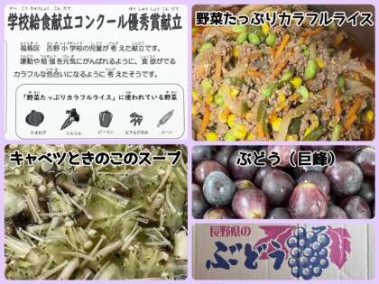 今日の献立は、野菜たっぷりカラフルライス・キャベツときのこのスープ・ぶどう・牛乳でした。