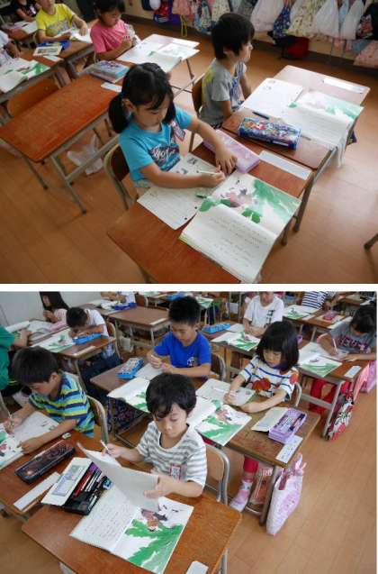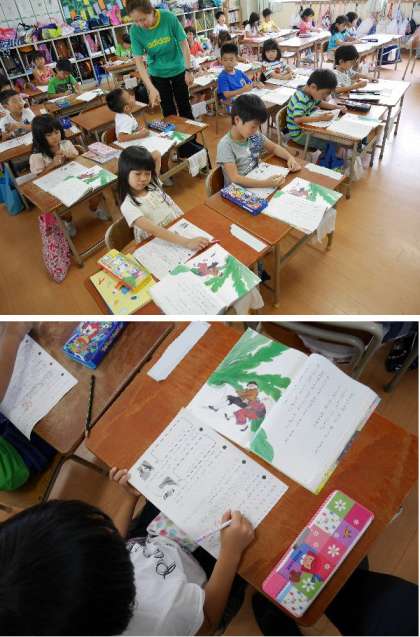 1年生の国語では、「大きなかぶ」を学習していました。登場人物の気持ちを考えながら読んでいます。算数では数を線のうえに並べて大きさを考えています。