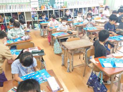 初めてカッターナイフを使うという子どもも多く、用紙に引いた線に沿って、一生懸命カッターナイフで切っていきました。