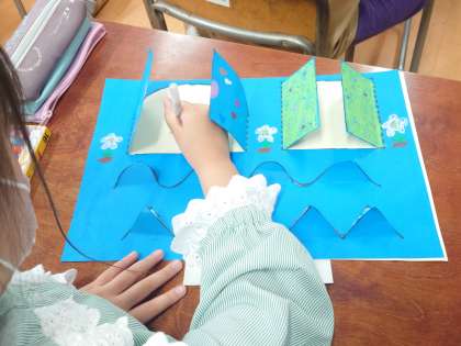 図画工作科の時間は、カッターナイフを使って紙にさまざまな切り込みを入れて、窓を開く仕組みを作りました。