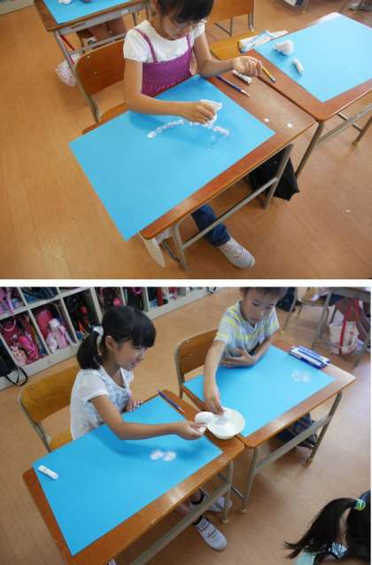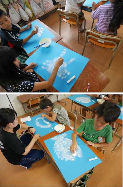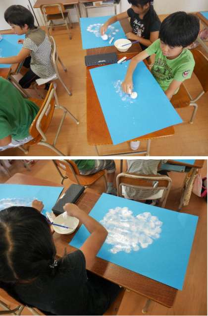 2年生が空色の画用紙に雲を描いています。白色の絵具の濃さを調節してぼかしながら上手に描いています。ハート型や魚型の雲が面白いですね。