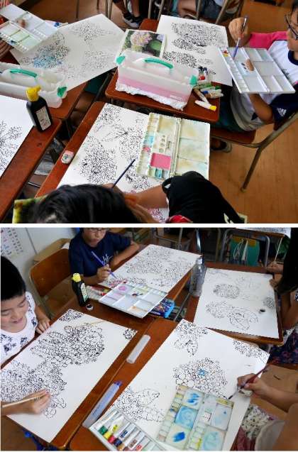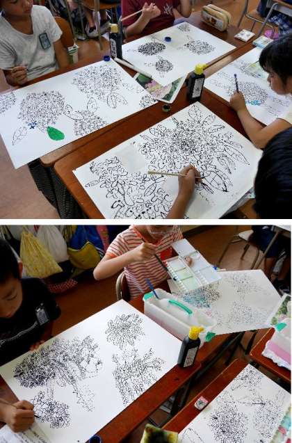 割りばしを削って、先に墨汁をつけて緻密な紫陽花の絵を描いています。水彩を淡彩で塗るととてもきれいですね。