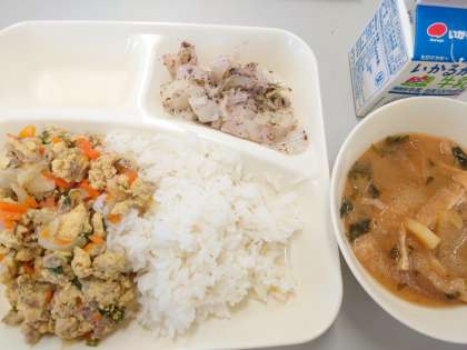 今日の献立は、他人丼・とうがんのみそ汁・キャベツの赤じぞあえ・牛乳でした。
