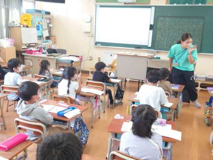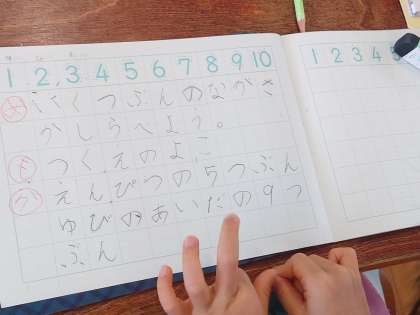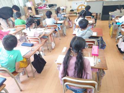 教室の机の横の長さが、えんぴつの長さのいくつ分になるのか、指の間の長さのいくつ分になるのか調べました。