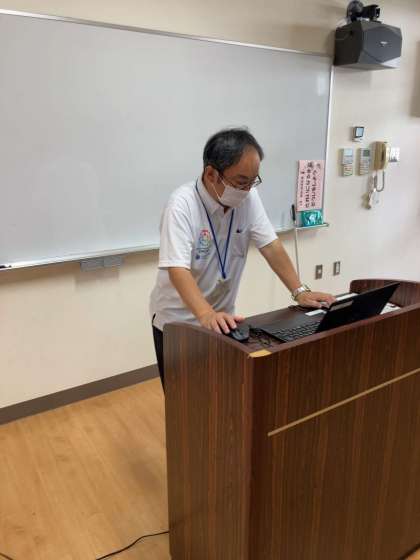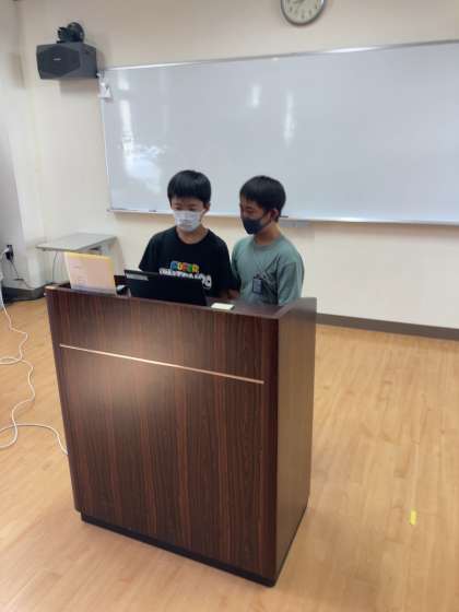 今日の児童朝会は、多目的室と各教室をオンラインで結んで行いました。