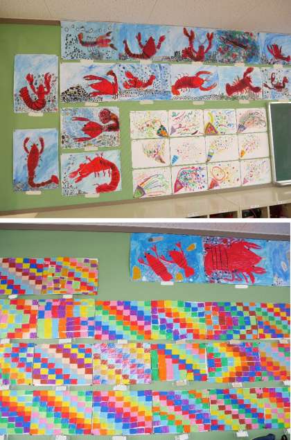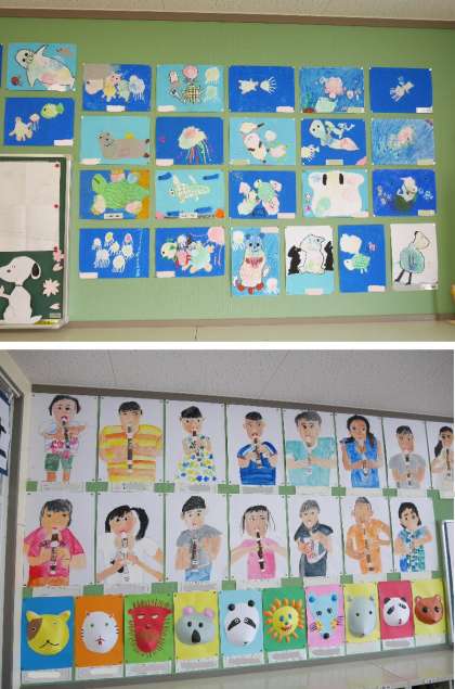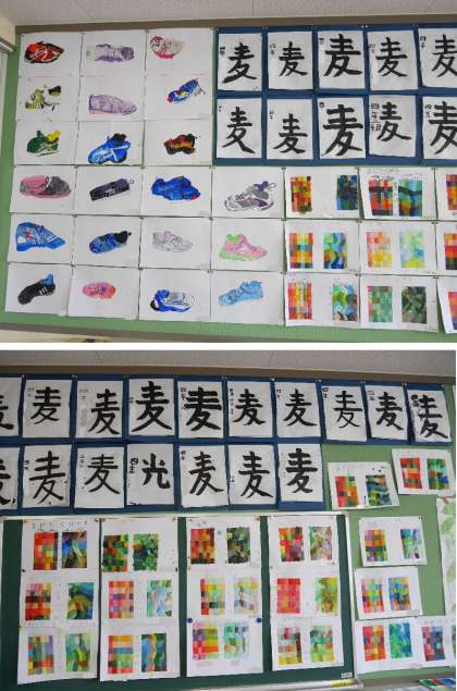 1学期末、子どもたちの作品がそろい、各教室の掲示がきれいにそろいました。