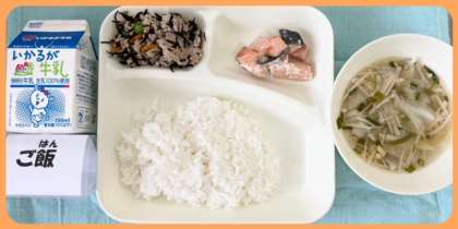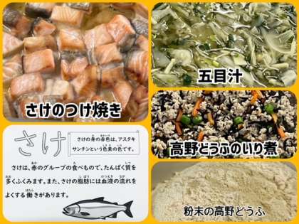 今日の献立は、さけのつけ焼き・五目汁・高野どうふのいり煮・ごはんでした。