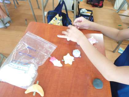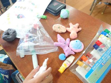 紙ねんどに絵の具を練りこみ、立体作品を制作しています。