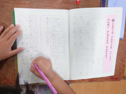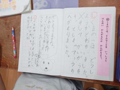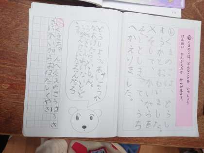子どもたちは、本文から「くまのこ」が考えたことを想像し、自分が考えたことを一生懸命ワークシートに書いていました。