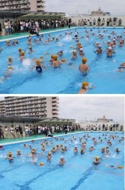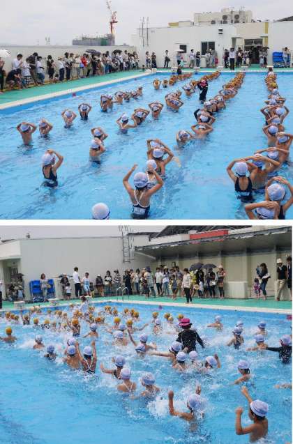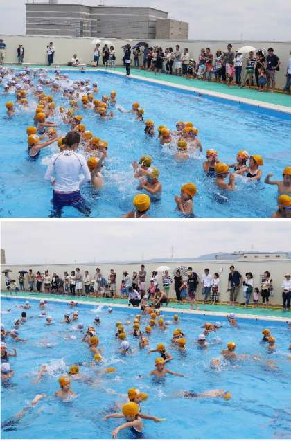 今日は土曜授業で水泳参加をおこないました。暑いなかたくさんの保護者にご来校いただきありがとうございます。1年生にとっては初めての水泳参観です。まだ水に慣れない子もいますが、楽しくがんばっていました。