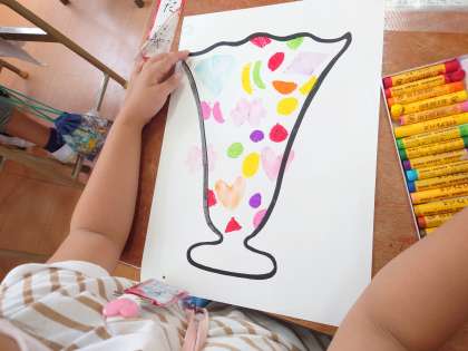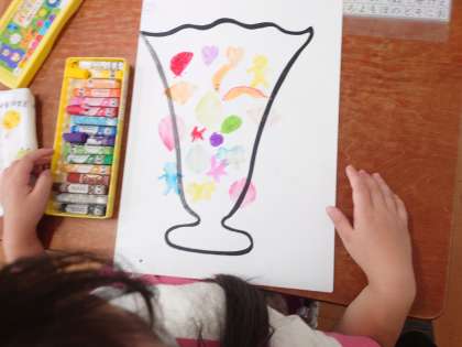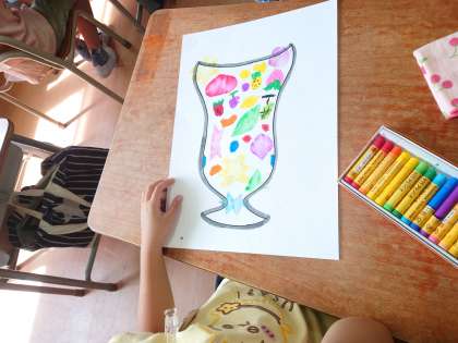 図工科の時間は、パスを工夫して使い、おいしそうなフルーツパフェを描いています。
