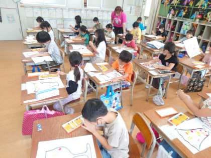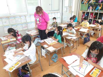 図工科の時間は、パスを工夫して使い、おいしそうなフルーツパフェを描いています。