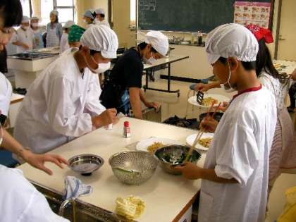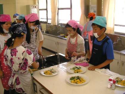 6年生は2学級一緒に家庭科室で調理実習をしました。今日のメニューはスクランブルエッグと野菜炒めです。野菜を切るのもいろいろな切り方があるんですね。それぞれの野菜とメニューにあわせた切り方が必要なんですね。とても味付けよくおいしかったよ。