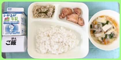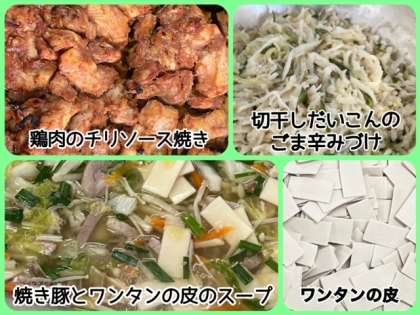 今日の献立は、鶏肉のチリソース焼き・焼き豚とワンタンの皮のスープ・切干しだいこんのごま辛みづけ・ごはん・牛乳でした。