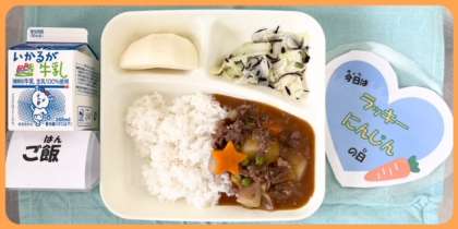 今日のハヤシライスは、小麦アレルギーのある児童も食べることができるように、上新粉を使っています。牛肉・じゃがいも・たまねぎ・にんじんなどを使い、水どき上新粉でとろみをつけ、調味料で味つけして煮こんでいます。
