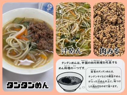 「タンタンめん」は、豚骨スープを使用し、チンゲンサイ・もやし・にんじんを使った汁めんに、ひき肉・白ねぎ・しょうが・にんにくを使い、テンメンジャンや赤みそなどで味つけした肉みそを配食時にのせて食べます。