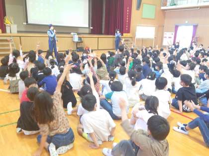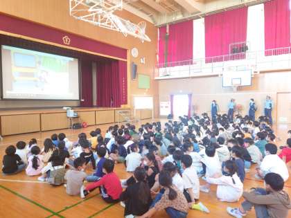 鶴見警察署の警察官の方に来ていただき、講堂で交通安全指導を行いました。