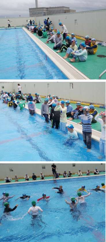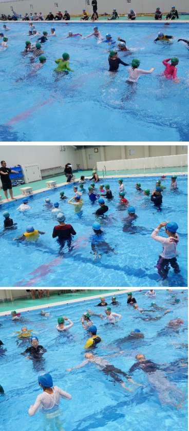 今日は、あいにくの天気ですが、午前中は晴れまも見えました。1学期最後のプール水泳がありました。5・6年生は私服を着衣して泳ぐ体験をしました。
