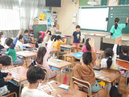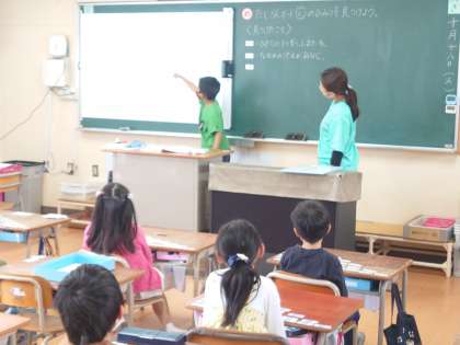 算数科の時間は、「たし算カード」を並べて、気付いたことについてみんなで話し合いました。