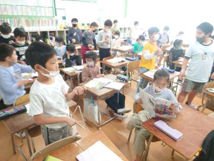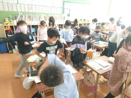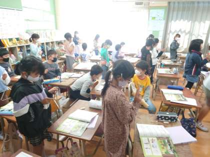 音楽科の時間は、「森のたんけんたい」の曲に合わせて、すず、タンバリン、ウッドブロック、カスタネットなどの打楽器を使ってリズムを打って演奏しました。