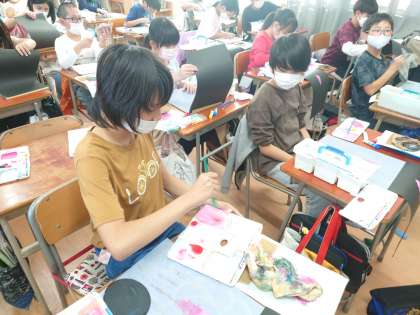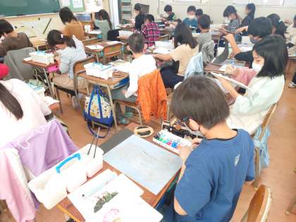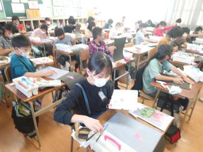 図画工作科の時間は、「シクラメン」を題材にして彫刻刀で版木を彫り、1色ずつ絵の具をつけて刷っています。
