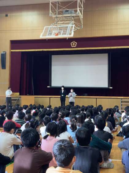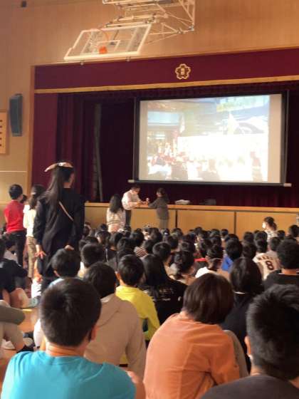 続いて、校長から10月10日に行われた「大阪メチャハッピー祭り」に出場した、子ども会の「焼野SO—RAN隊」の活躍について紹介し、代表の子どもに「メチャハピー祭り」のトロフィーを全校児童の前であらためて校長から渡しました。