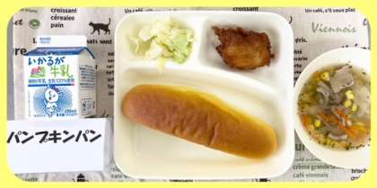 今日の献立は、たらフライ・スープ・あっさりキャベツ・パンプキンパン・牛乳でした。