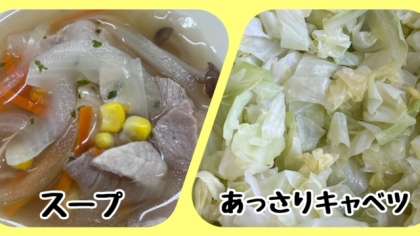 スープは、豚肉・たまねぎ・にんじん・コーン・しめじ、青みにパセリを使っています。