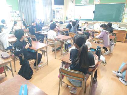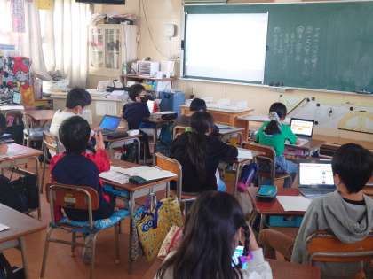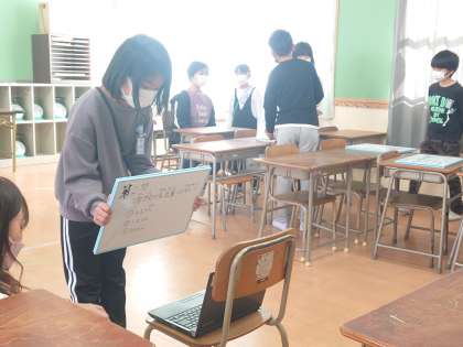 今日の集会は、学習室と各教室をオンラインで結んで行いました。