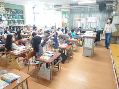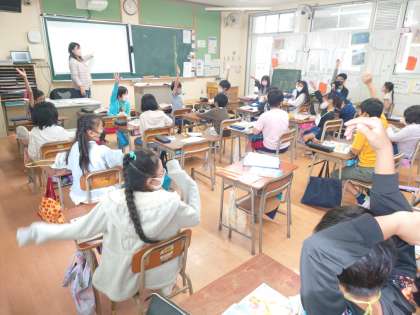 英語活動の時間は、色や形の英語の表現を使って、音楽に合わせて"What do you want?"のやりとりを学習しました。