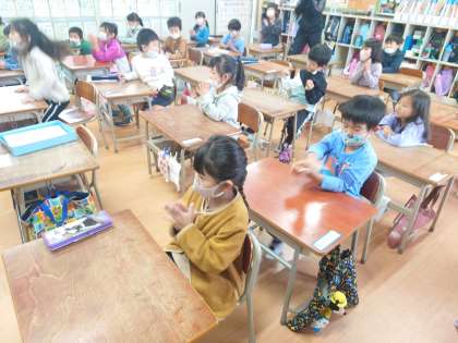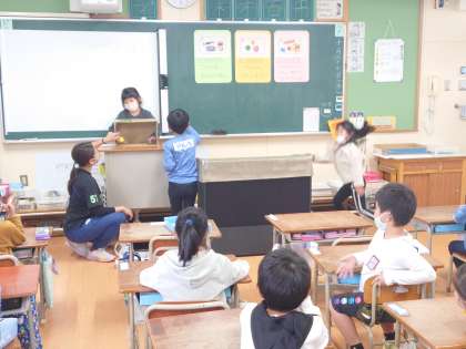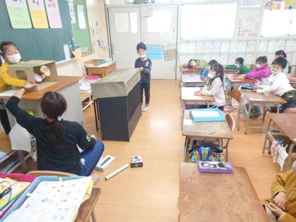 算数科の学習では、箱の中に入っているものがどんな形か、手探りで考えました。