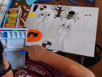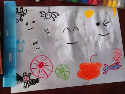 子どもたちは、「にじみ」の技法を使い、絵の具の使い方を工夫して、おばけやかぼちゃなどの絵を描いていきました。