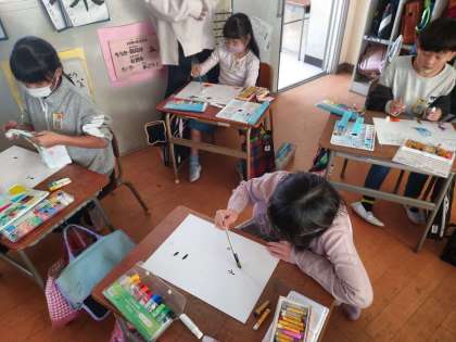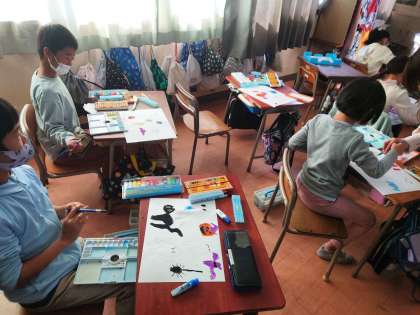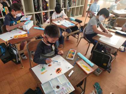 子どもたちは、「にじみ」の技法を使い、絵の具の使い方を工夫して、おばけやかぼちゃなどの絵を描いていきました。