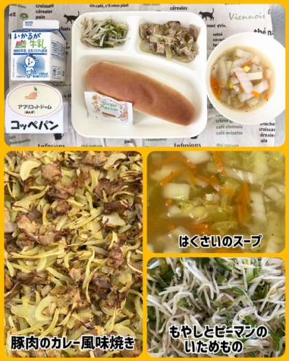 今日の献立は、豚肉のカレー風味焼き・はくさいのスープ・もやしとピーマンのいためもの・コッペパン・アプリコットジャム・牛乳でした。