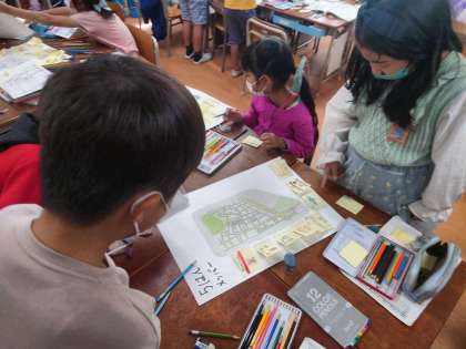校区たんけんで調べたことをもとに、グループで協力して絵地図にまとめています。