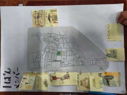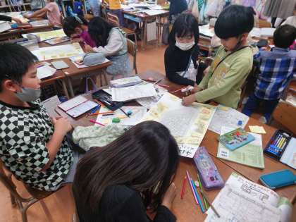 校区たんけんで調べたことをもとに、グループで協力して絵地図にまとめています。