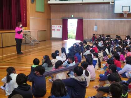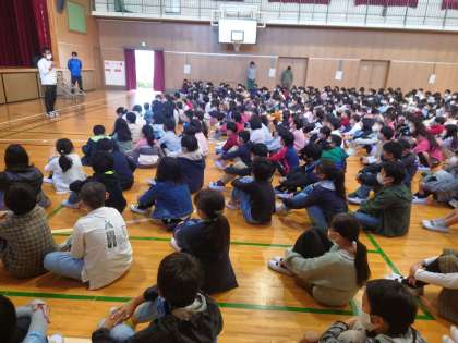 今日の児童朝会は、全校児童が講堂に集まって行いました。