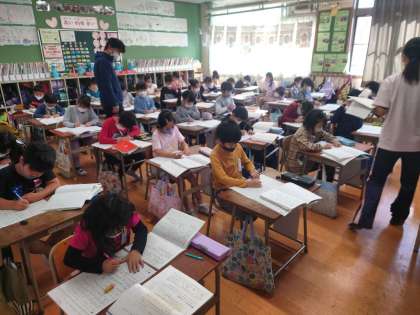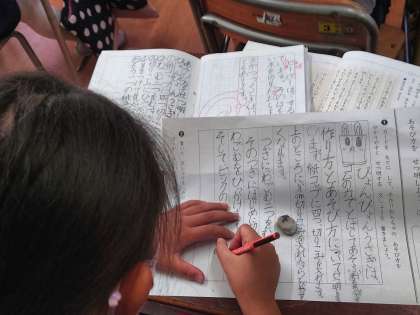 国語科の時間は、手作りおもちゃ「ぴょんぴょんうさぎ」の遊び方を分かりやすく説明する文章を書きました。