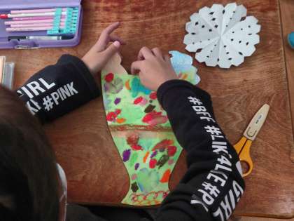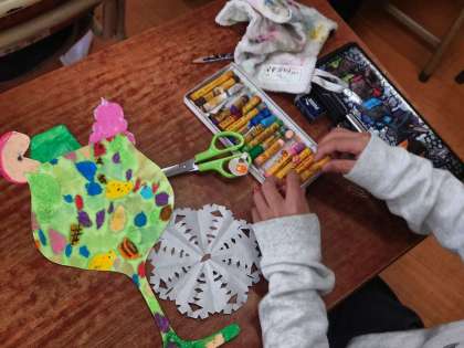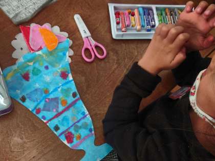 図工科の時間は、パスを工夫して使い、おいしそうなフルーツパフェを描いています。