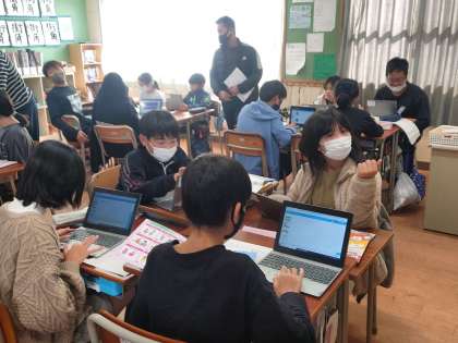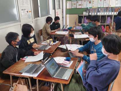 英語科の時間は、「自分の心に残ったカレー」について、「どんな材料を使っているのか」「生産地はどこか」などを調べ、"I usually eat 〜""The 〜is from 〜"などの英語の表現を使って発表をします。