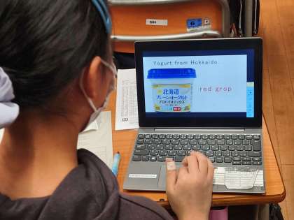 英語科の時間は、「自分の心に残ったカレー」について、「どんな材料を使っているのか」「生産地はどこか」などを調べ、"I usually eat 〜""The 〜is from 〜"などの英語の表現を使って発表をしました。
