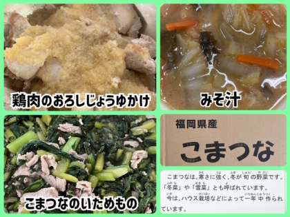 今日の献立は、鶏肉のおろしじょうゆかけ・みそ汁・こまつなのいためもの・ごはん・牛乳でした。