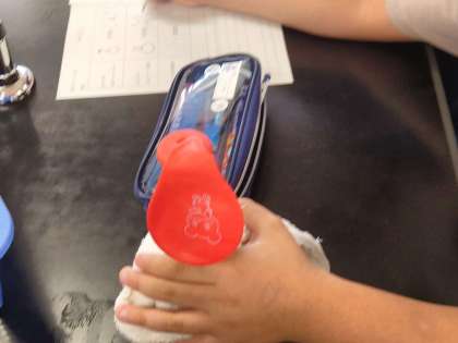 今日は、容器に閉じ込めた空気をあたためるとどうなるのか、実験で調べました。
