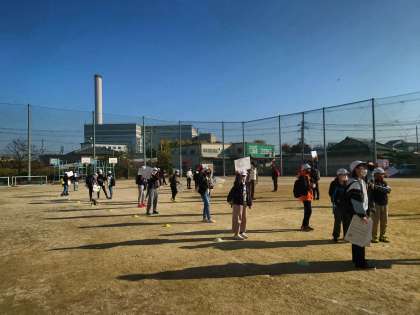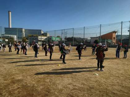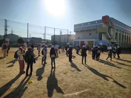 6年生は先に運動場に出て、班の札を見せながら下級生の集合を待っています。
