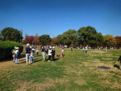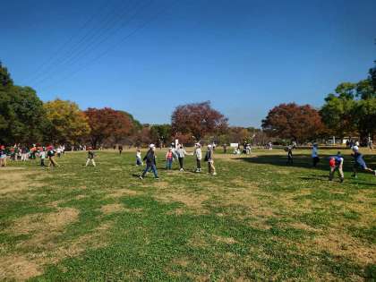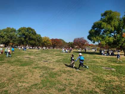 大芝生で班で遊んでいます。