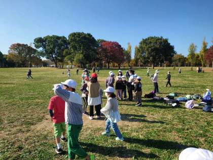 大芝生で班で遊んでいます。