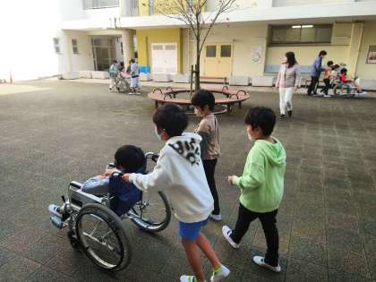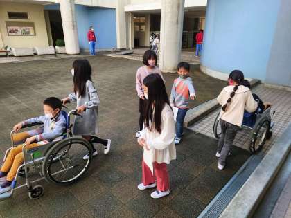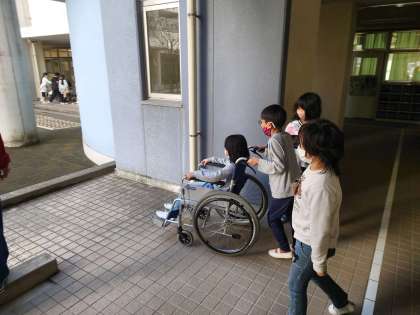 4時限目はコースを中庭に移し、グループで車いすを押す体験をしました。