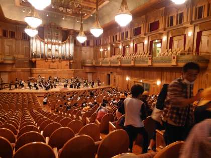 ステージでは、オオサカ・シオン・ウインド・オーケストラの方々が音出しをしています。