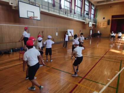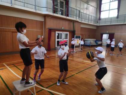 体育科の時間はポートボールの練習をしています。